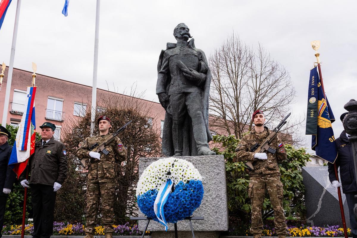 Položitev cvetja k spomeniku Rudolfa Maistra, slovenskega pesnika, generala in borca za severno mejo, ter njegovih borcev s Kamniškega.
